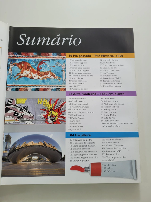 Este livro conduz a criançada a um passeio colorido e divertido pela arte ao longo da História. Com belas imagens, explica de forma didática a evolução dos estilos e das técnicas, desde a arte pré-histórica até a arte de rua. Apresenta algumas das mais importantes obras-primas, os principais movimentos e escolas, assim como a trajetória de grandes artistas, como Monet, Van Gogh, Matisse, Picasso, Miró e Andy Warhol. Traz ainda um capítulo especial sobre escultura.