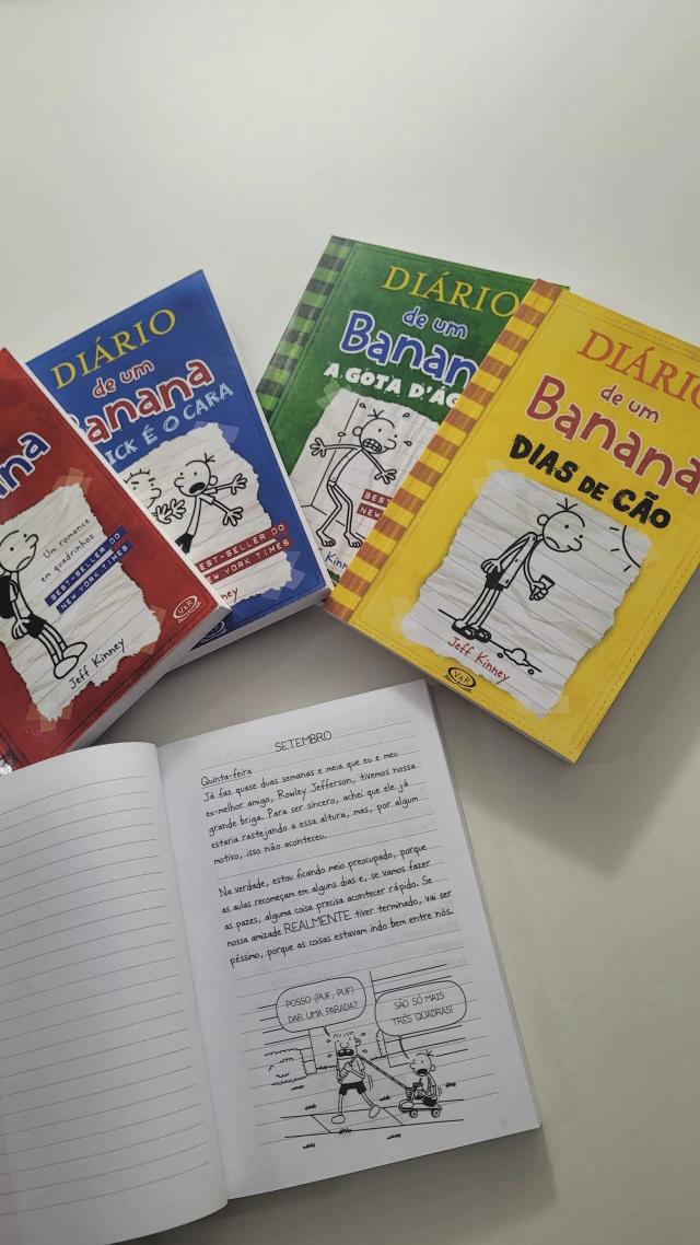 Prepare-se para dar boas risadas com as trapalhadas mais hilárias do mundo literário! Este box reúne os cinco primeiros volumes da série que conquistou milhões de leitores no mundo inteiro: Diário de um Banana. Conheça Greg Heffley, um garoto esperto (ou pelo menos ele acha que é) tentando sobreviver à escola, aos pais, ao irmão mais velho Rodrick, e às enrascadas do dia a dia tudo isso registrado com muito sarcasmo, desenhos engraçados e situações que todo mundo vai reconhecer! Do pavor da educação física à vergonha alheia de ser "descoberto" pelos pais, Greg mostra que crescer não é nada fácil... mas pode ser MUITO divertido! jf?? O que vem no box? Vol. 1 Diário de um Banana Vol. 2 Rodrick é o Cara Vol. 3 A Gota DÁgua Vol. 4 Dias de Cão Vol. 5 A Verdade Nua e Crua