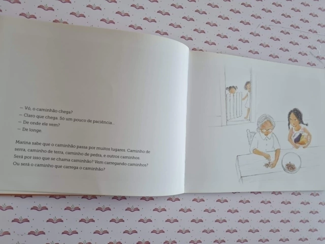 O caminhão chega? Falta muito? Marina e as irmãs esperam. Faltam alguns dias ainda. O pai, a mãe, o avô, a avó, toda a família aguarda a chegada do caminhão. E o que traz esse caminhão? De onde ele vem? Você também pode seguir com o caminhão, passar por lugares diversos, sentir o cheiro da terra, conhecer novas paisagens e novas histórias... ou esperar com a família o dia em que chega o caminhão.