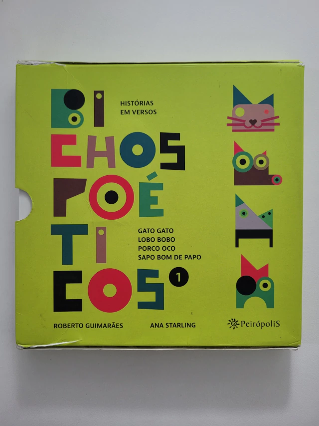 Livros contidos na coleção: Gato Gato; Lobo Bobo; Porco Oco; Sapo Bom de Papo. Um gato que é gato, caseiro e do mato. Um lobo que foge dos livros para inventar suas próprias histórias. Um porco que fica oco por comer as consoantes do próprio nome. Um sapo brincalhão com seu papo furado cheio de ar. Nesses coloridos e bem-humorados bichos poéticos, os versos de Roberto Guimarães e as ilustrações de Ana Starling se fundem para multiplicar sentidos, muitas vezes surpreendentes.