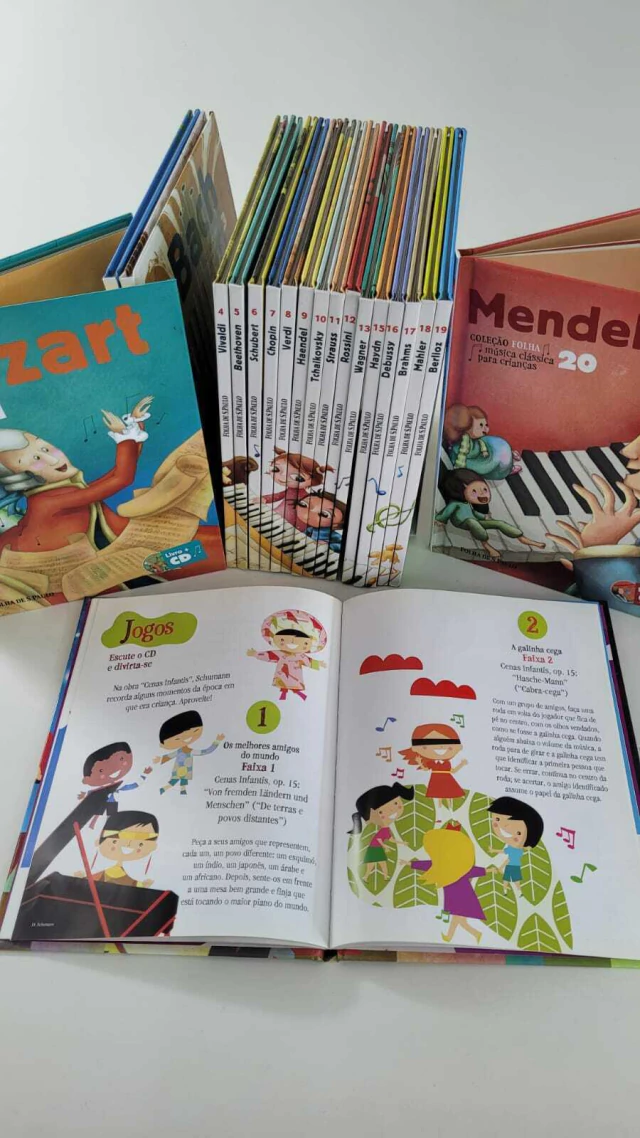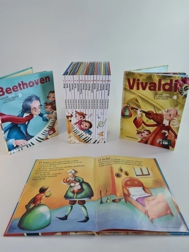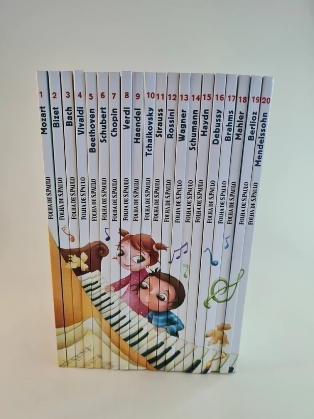 Essa coleção contém 20 Livros/CDs, que abordam de forma bem interessante a historia de alguns compositores: Wolfgang Amadeus Mozart; Georges Bizet; Johann Sebastian Bach; Antonio Vivaldi; Ludwig van Beethoven; Franz Schubert; Frederic Chopin; Giuseppe Verdi; Georg Friedrich; Haendel; Piotr Ilich Tchaikovsky; Johann Strauss; Gioacchino Rossini;Richard Wagner; Robert Alexander Schumann; Joseph Haydn; Claude Debussy; Johannes Brahms; Gustav Mahler; Hector Berlioz; Felix Mendelssohn. Com o intuito de apresentar as crianças aos compositores mais conhecidos da música erudita, cada volume tem uma biografia ilustrada, junto com um cd com as composições mais populares, as quais a criança possivelmente já ouviu em desenhos, filmes ou comerciais. Também tem dois personagens, Dó e Mi, que viajam pelo tempo, além de situações curiosas , informações importantes e sugestões de atividades sobre cada compositor. Coleção indispensável para a Biblioteca das crianças.