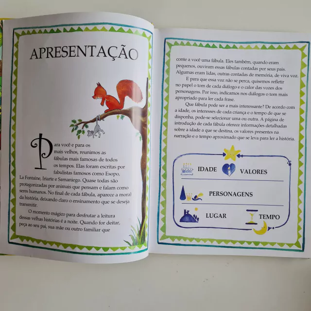 Este é um livro elaborado para as crianças, é claro, mas também para os pais, encarregados de transmitir a elas as velhas histórias que um dia eles também ouviram. E, para que esta tradição não se perca, procuramos reunir aqui as fábulas mais famosas de todos os tempos, refletindo no papel o tom de cada diálogo, o calor e a cor das vozes dos personagens, com vocabulário simples e compreensível, adaptado à linguagem de meninos e meninas de todas as idades. O livro traz ainda um quadro indicativo com a faixa etária, os valores trabalhados e o tempo de duração da leitura.