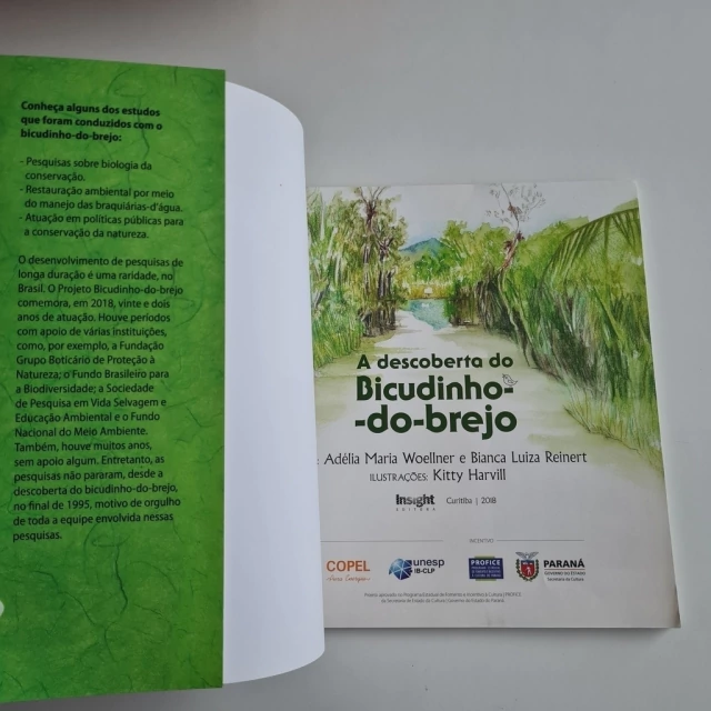 O livro infantil A descoberta do Bicudinho-do-brejo conta de maneira muito lúdica como os biólogos Bianca e Marcão descobriram uma nova espécie de ave, que foi vista pela primeira vez em um brejo no litoral do Paraná. A história é real: o bicudinho-do-brejo (Formicivora acutirostris) foi descrito pelos pesquisadores Marcos Bornschein e Bianca Luiza Reinert (uma das autoras do livro) em 1995! O livro mostra um pouco do trabalho de campo dos ornitólogos, explicando como é feita a captura das aves para que sejam medidas, pesadas e anilhadas. Este tipo de pesquisa é de grande importância, pois permite avaliar o tamanho das populações das aves e saber como cada passarinho está de saúde. Infelizmente, não demorou para que Bianca e Marcão descobrissem que existem poucos bicudinhos-do-brejo e que a espécie está ameaçada de extinção. Por que isto estaria acontecendo? Porque os brejos, ambiente onde vivem os bicudinhos, estão sendo destruídos.