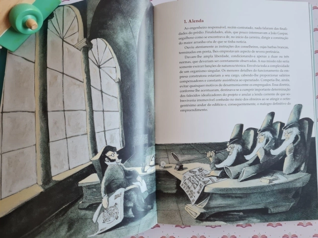 Sob as ordens do engenheiro João Gaspar está a construção de um edifício com infinitos andares, o maior arranha céu de que se tem notícia. Contratado por um Conselho Superior para tal tarefa, mesmo sem conhecer as finalidades do empreendimento, seu dever é cuidar de cada detalhe da complexa obra e evitar, a qualquer custo, desavenças entre os operários, em razão da lenda de que, ao chegarem ao octingentésimo andar sim, oitocentos andares! , os conflitos entre os trabalhadores seriam inevitáveis. Além disso, João Gaspar não poder ter a pretensão de ver o prédio finalizado. Absurda, a narrativa de Murilo Rubião, mestre do realismo fantástico, tem sua estranheza poetizada pelas ilustrações de Nelson Cruz.