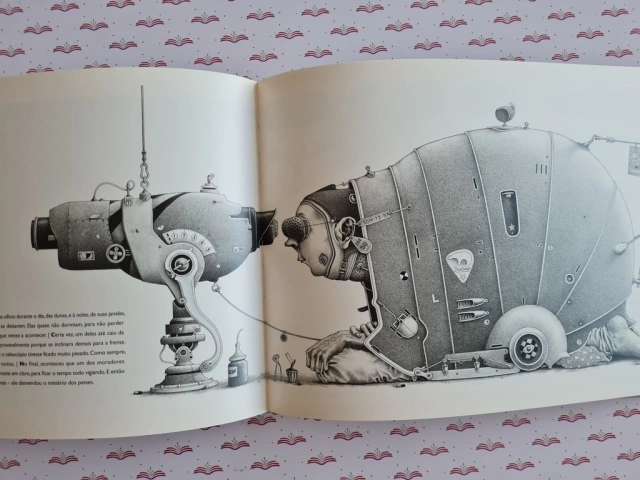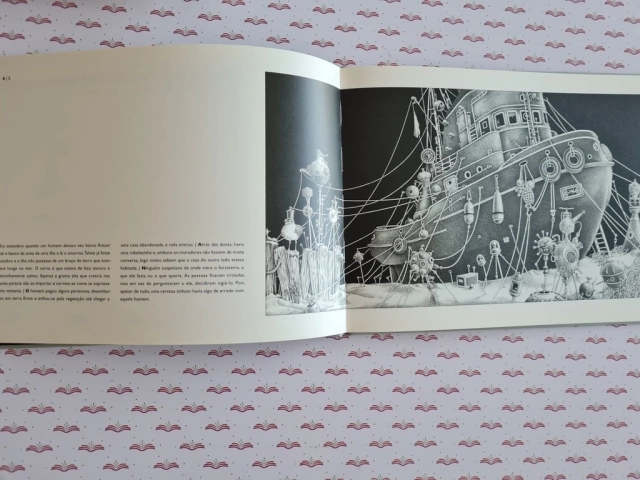 Vencedor dos principais prêmios internacionais de literatura infantil e de ilustração, Estava escuro e estranhamente calmo rendeu ao estreante Einar Turkowski um lugar de destaque entre os grandes autores contemporâneos. Nesta história, um homem misterioso desembarca em uma ilha e muda a pacata rotina dos que ali vivem. Habita uma casa abandonada onde, suspeitosamente, todas as manhãs surgem peixes pendurados de cabeça para baixo. Peixes que os vizinhos também gostariam de ter. Desconfiados - e com uma pontinha de inveja -, logo se ocupam em desvendar o segredo por trás daquela figura fascinante. O traço fino de Turkowski, que não poupa na capacidade de ser inventivo, dá conta de todos os detalhes do universo surrealista. A envolvente trama, carregada de suspense, transita entre a ciência imaginária e o nonsense, e ainda abre espaço para discutir um assunto bem real: o impacto de uma grande descoberta entre os habitantes de uma vila tranquila. Um lançamento sob medida para crianças inventivas e curiosas, abertas ao diferente. Na opinião do jornal alemão Die Zeit, "uma obra de arte cheia de virtudes".