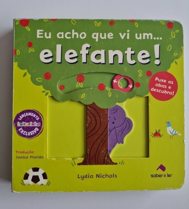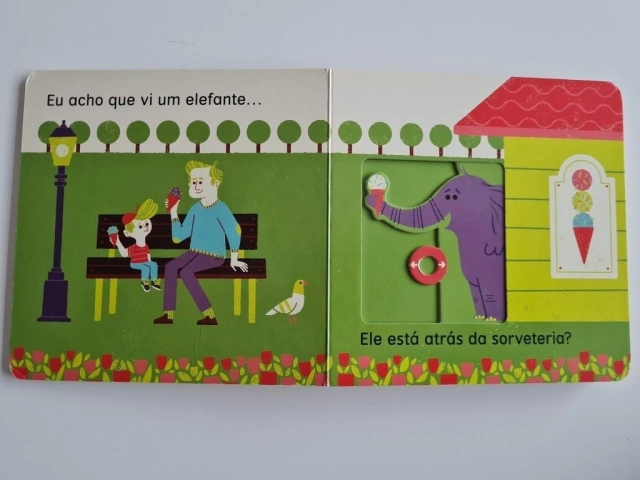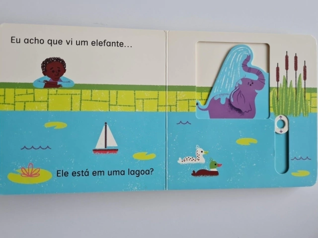 Há um elefante escondido em algum lugar dentro deste livro. Empurre e puxe as abas para ver se você consegue encontrá-lo!