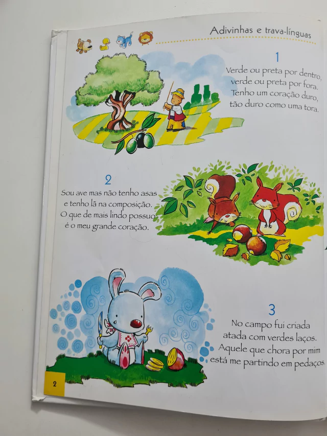 Adivinhas em rimas prendem a atenção da criança e facilitam a interação com o mundo a sua volta. Com o apoio de belas ilustrações, os textos fazem descrições originais de seres-vivos e objetos, estimulando a curiosidade e enriquecendo o vocabulário. Depois das adivinhas, vem as trava-línguas, com textos que funcionam como jogos linguisticos que trabalham o raciocínio mental e a fala das crianças. Leitura educativa com diversão garantida.