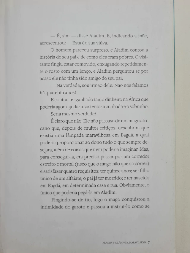 O jovem Aladim vivia com sua mãe, viúva, em Bagdá. Um dia, um homen bateu na porta e disse ser tio dele, irmão de seu falecido pai. Contou que havia ficado rico e que ajudaria a cunhada e o jovem sobrinho. Mas o que eles não sabiam é que o homen era um malvado feiticeiro, que precisava de Aladim para conquistae um bem precioso: a lampada maravilhosa!