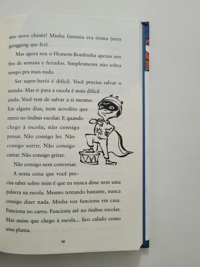 Algumas coisas que você precisa saber sobre Alvin Ho: 1. Ele tem medo de tudo. Trens, pontes, professoras substitutas, garotas, escola. De tudo. 2. Ele é americano, de Concord, Massachusetts, nome difícil de escrever. 3. Ele adora o Aquaman, a Mulher Maravilha e todos os supre-heróis do mundo. Na verdade, ele também é um supre-herói: o Homem-Bombinha! 4. Está se esforçando para ser um cavalheiro, como seu pai, mas existem muitas regras difíceis de lembrar. 5. Ele consegue falar em casa e no ônibus da escola, mas nunca, de jeito nenhum, na escola. Dá muito medo. (Veja o item 1.)