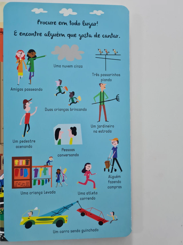 Encontre centenas de personagens e objetos neste livro repleto de ilustrações impressionantes. As páginas se desdobram em cenários gigantes, revelando surpresas estranhas e marabilhosas na cidade, no campo, em alto-mar, na estação de trem, na construção e no aeroporto. Voce vai se divertir vencendo este desafio com figuras engraçadas e cheias de estilo!