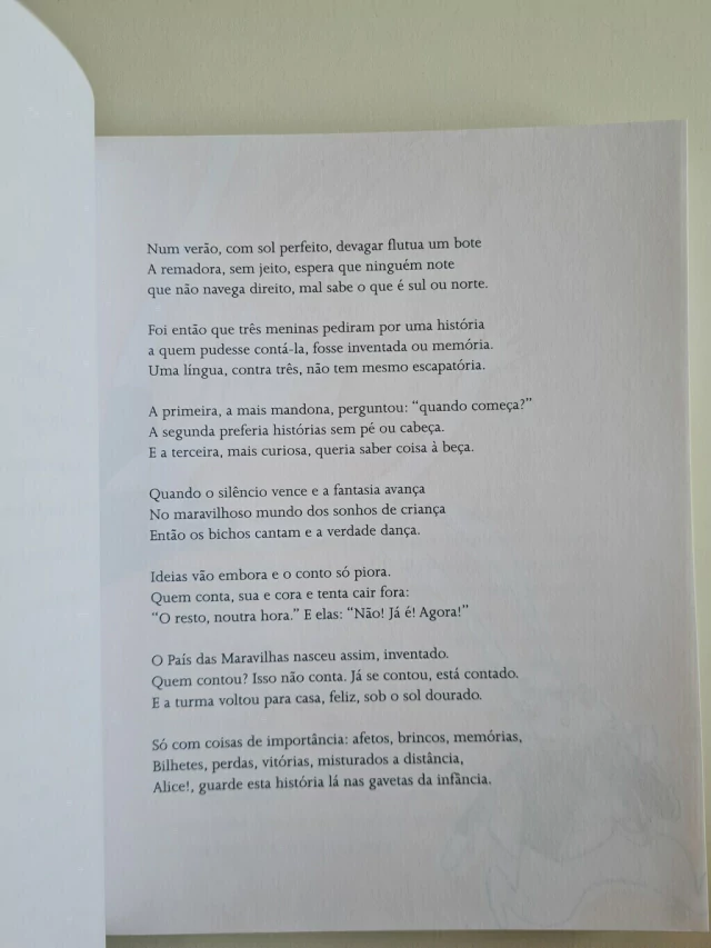No dia 4 de julho de 1862, durante um passeio de barco, ele inventou e contou esta história a pedido de três irmãs: Lorina, de 13 anos, Alice, de 10 anos, e Edith, de 8 anos. Alice gostou tanto que pediu a Carroll que escrevesse a história, o que ele fez, à mão, página por página, incluindo dezenas de ilustrações. Por isso mesmo, Alice no País das Maravilhas é desde o seu nascimento um livro para crianças. Crianças inglesas, do século XIX. De lá para cá, entretanto, os adultos gostaram tanto das aventuras da menina que viaja para uma terra maravilhosa e vive mil aventuras, que acabaram por transformá-lo num livro complexo, que para ser compreendido precisa de notas de pés de página e longas explicações sobre a língua inglesa ou sobre os hábitos da Oxford vitoriana. Há boas traduções brasileiras feitas para adultos que querem estudar seriamente o livro e há centenas de versões reduzidas da história, feitas para criancinhas. Este Aventuras de Alice no País das Maravilhas não é nem uma coisa nem outra. É uma tradução do texto integral de Carroll, feita por Jorge Furtado e Liziane Kugland para crianças brasileiras do século XXI. Como gostam de dizer os autores/tradutores, essa edição parte do princípio de que uma piada só tem graça se você a entende. E, de preferência, sem precisar que ninguém a explique. Em 168 páginas recheadas de ilustrações de Mariana Newlands, o clássico de Lewis Carroll ganha tintas atuais, que só confirmam sua permanência e importância.