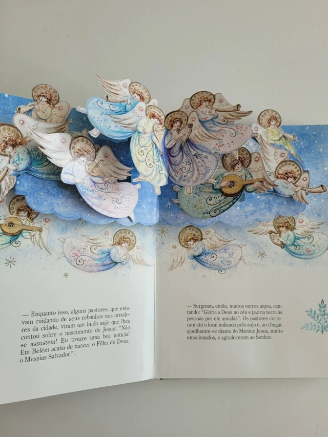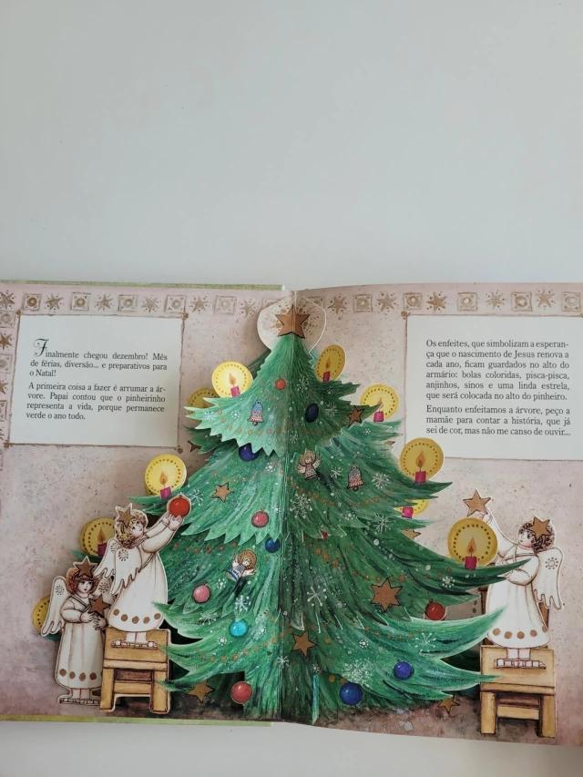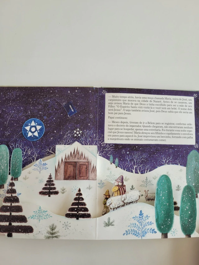 Neste livro, o nascimento de Jesus é descrito por meio de uma lúdica história de Natal, que apresenta os detalhes mais importantes da chegada do Menino Deus. Ilustrações interativas e tridimensionais trazem uma surpresa a cada página, com detalhes que podem ser girados ou puxados, revelando mais ilustrações. Enquanto a criança acompanha o relato bíblico, ajuda os anjos a enfeitar a árvore, faz a estrela brilhar e badala o sino que anuncia o nascimento do Menino Jesus. Um lindo livro e uma ótima sugestão de presente para o Natal. O texto original foi escrito por Francesca Crespi e teve livre adaptação para o português por ANDRÉIA SCHWEITZER.
