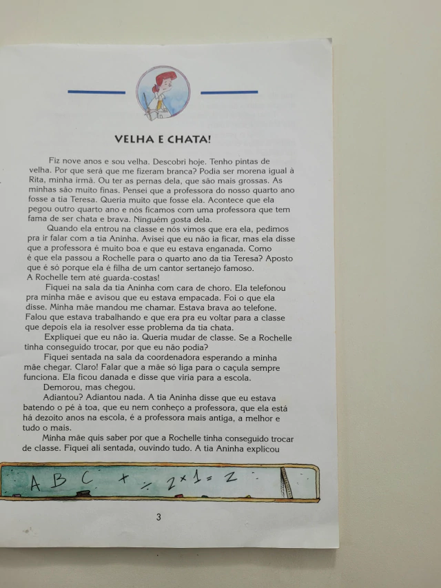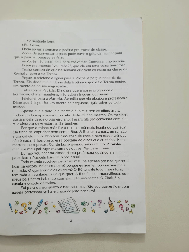 Esta é a história de Rebeca, uma esperta garota de 9 anos que está inconformada com sua nova professora da terceira série, que tem fama de chata e brava. Enquanto Rebeca faz de tudo para não gostar da "senhora de cabelos vermelhos", o leitor se diverte com seu dia a dia: a família, os amigos, os divertimentos, as chateações, o caderno de perguntas... Mas também percebe que as pessoas são diferentes e que devemos aprender a conviver e a respeitar essas diferenças.