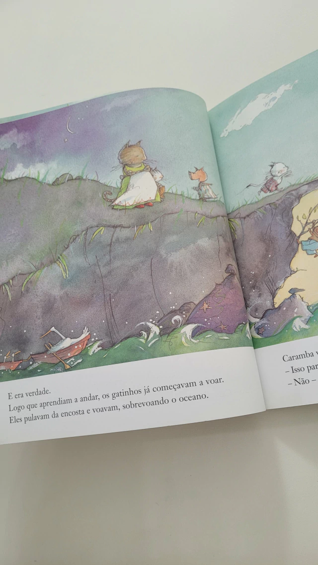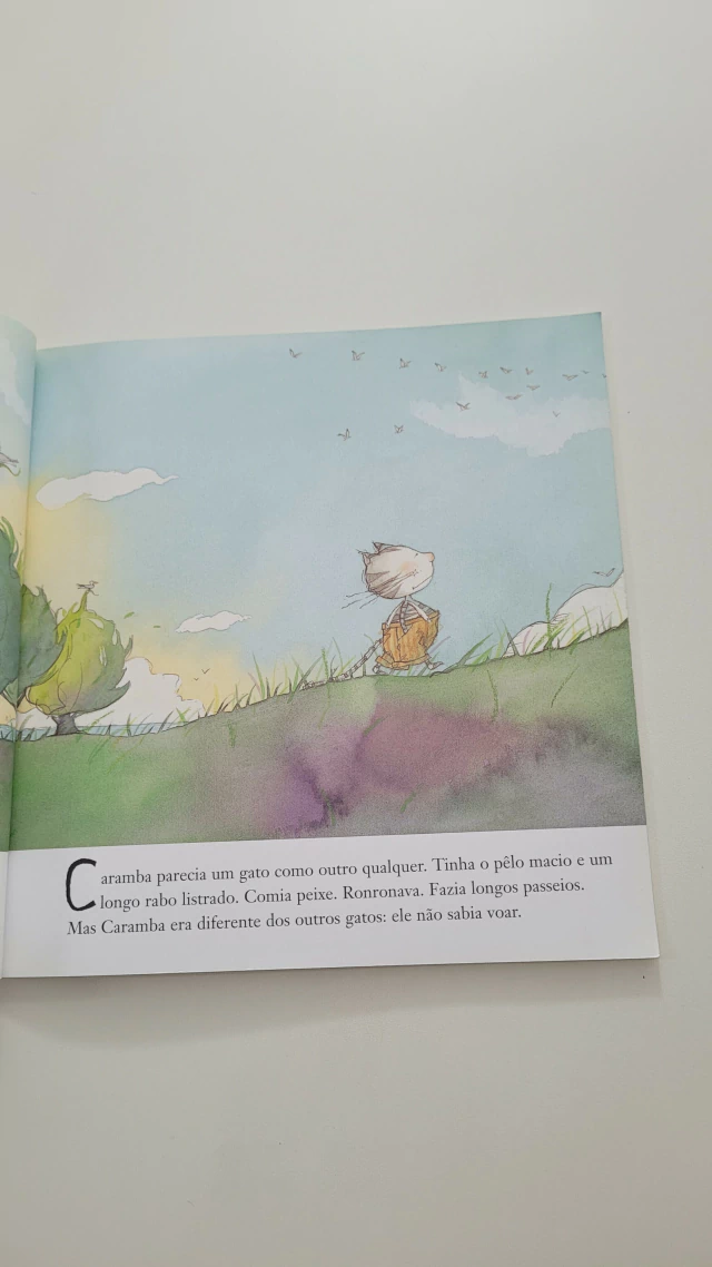 Caramba é um gato gordo, peludo e listrado com um grande problema. "Todos os gatos do mundo sabem voar", suspira, "menos eu!" Caramba adoraria voar e planar entre as nuvens, sentir o vento assobiando em seu pelo. Ele tenta voar alto repetidas vezes, mas sempre cai de cara no chão, até que finalmente aceita, com tristeza, que está preso à terra. "Não seja tão medroso", gritam seus primos. "Todos os gatos nasceram para voar!" Eles agarram suas patas e o levam para o céu para uma aula improvisada de voo que termina com um grande mergulho... e uma descoberta surpreendente nesta história lindamente ilustrada com uma mensagem especial de autoaceitação.