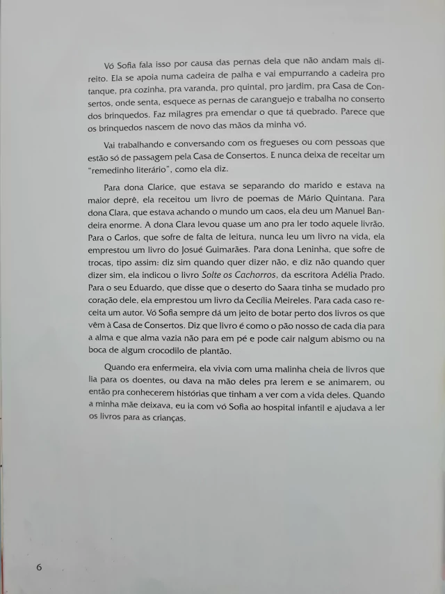 Eu sou a Olímpia e sempre passo férias no casarão da minha avó Sofia. Ela é uma bruxa, mas daquelas que só fazem feitiços para a vida brilhar. Na oficina de consertos de brinquedos, eles nascem de novo das mãos da minha vó! Enquanto trabalha, ela vai conversando com fregueses e nunca deixa de receitar um "remedinho literário", como ela diz. Para cada caso a minha vó receita um autor. Diz que livro é o pão nosso de cada dia para a alma e que alma vazia não para em pé e pode cair nalgum abismo ou na boca de algum crocodilo de plantão.