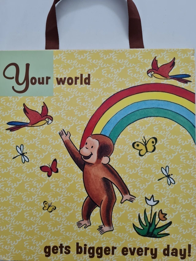 A colorful fold-out board book and growth chart parents and little ones wont want to miss an inch! Celebrate growing little ones and their growing worlds with this beautiful fold-out board book. Parents and babies can use one side of the book to discover a variety of growing things through charming images of swaying trees, tropical fruits, baby animals, a celebratory poem, and a mirror so baby can watch herself grow. Flip the book over for a gorgeous growth chart that helps parents track their childs height, inch by colorful inch. This book is made of sturdy, lightweight board with a ribbon hanger to be securely hung on a wall. The book comes packaged in an elegant gift box and includes a sheet of Curious George stickers and height markers for the growth chart.