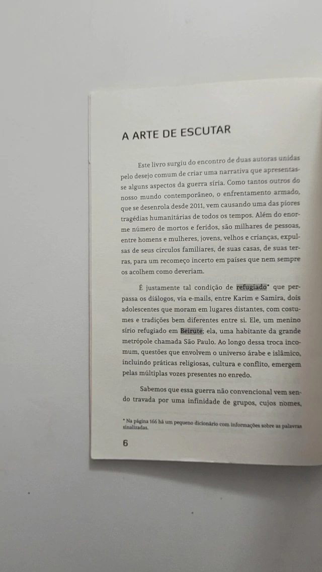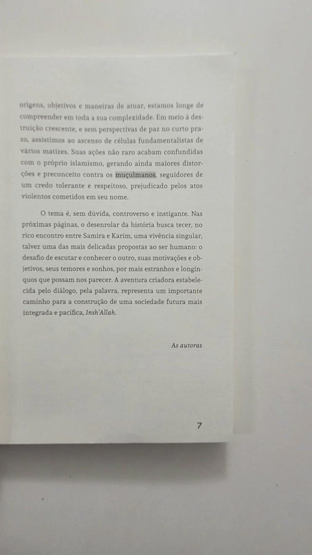 Nestas páginas você vai descobrir a história do encontro entre Samira e Karim. Nascidos em países tão distantes entre si, quanto Brasil e Síria, eles envolvem-se em uma experiência que vai mudar suas visões de mundo. Por meio da troca de mensagens, os dois vivenciam uma das mais importantes propostas do ser humano: o desafio de conhecer e aceitar o outro, suas culturas e tradições, seus temores e sonhos, por mais estranhos e diferentes que possam parecer à primeira vista. Aqui, veremos como a aventura criadora estabelecida pelo diálogo, pela palavra, representa o principal caminho para a construção de uma sociedade mais integrada e tolerante.