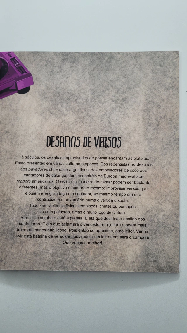 Se liguem os brothers! Se liguem as minas! Está para começar uma batalha de versos nunca vista ou ouvida em toda a história dos desafios rimados. O violeiro Claudinei, com sua violinha caipira, vai encarar o pancadão do famoso rapper e MC estrangeiro, Mr. John! Será que o matuto vai ter alguma chance? Será que suas dez cordinhas de aço serão páreo para os 10.500 watts de potência do famoso rapper? E quem é o misterioso personagem que aparece justo no momento mais feroz do combate? Leia o livro e descubra o final de mais uma história de ação e poesia rimada do premiado autor Fábio Sombra. Um livro que mostra que literatura de cordel, rap e cultura pop têm tudo a ver, tá ligado?