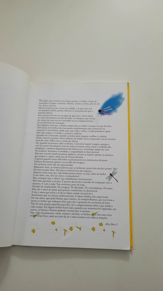 Do encontro entre Alice Ruiz e Camila Jabur, surgiram esses haikais sobre animais. São suas brincadeiras, seus olhares e seus sentimentos. E são brincadeiras, olhares e sentimentos. Do encontro entre as autoras e Fê, o ilustrador, a poesia cresce, tornando-se viva para os bichos e dentro das pessoas.