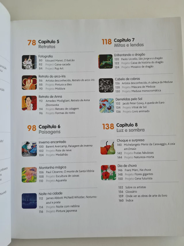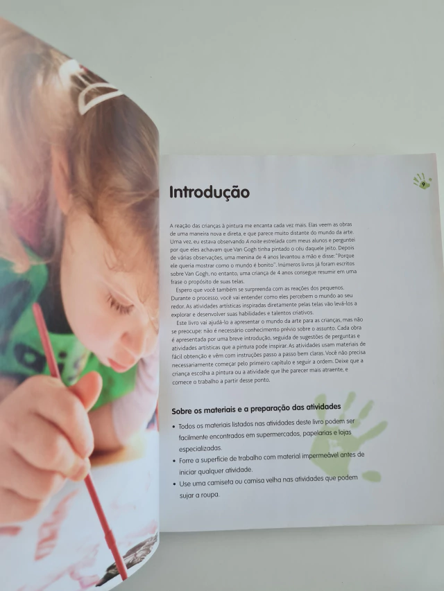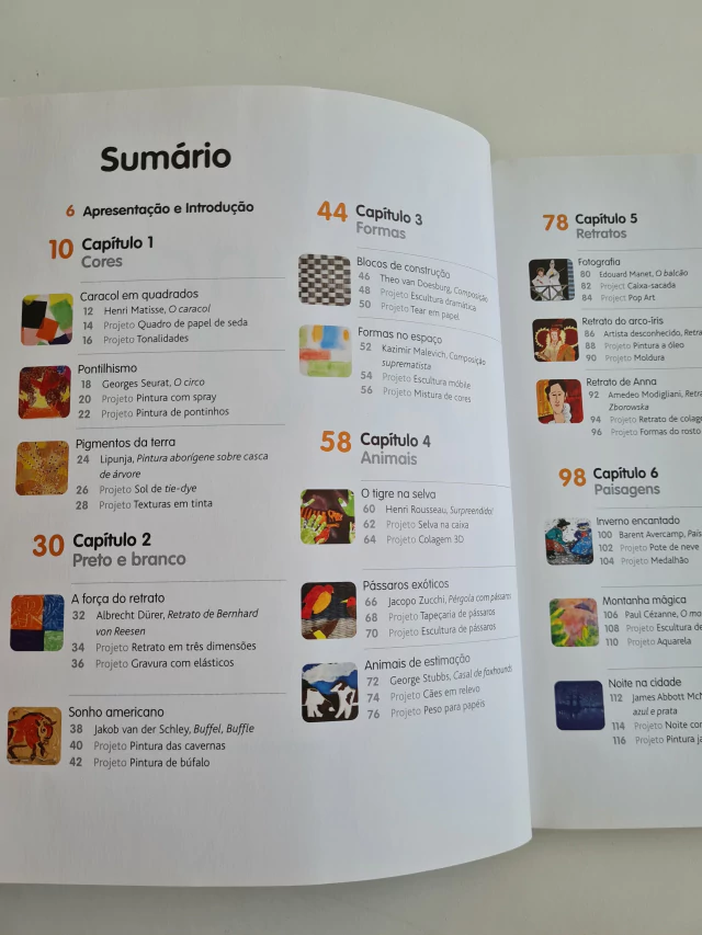 As histórias e os significados contidos em 21 obras-primas servem de inspiração para que as crianças, sob orientação de um adulto, elaborem 42 projetos. Usando materiais facilmente encontrados, elas vão desenvolver a habilidade criativa, colocando e m prática técnicas como pontilhismo, relevo e mosaico. De forma lúdica e divertida, este livro ensina como usar as cores, as formas, o preto e branco, a luz e a sombra. Explica como recriar animais, paisagens e retratos, e desvenda o fantástico mundo dos mitos e das lendas.