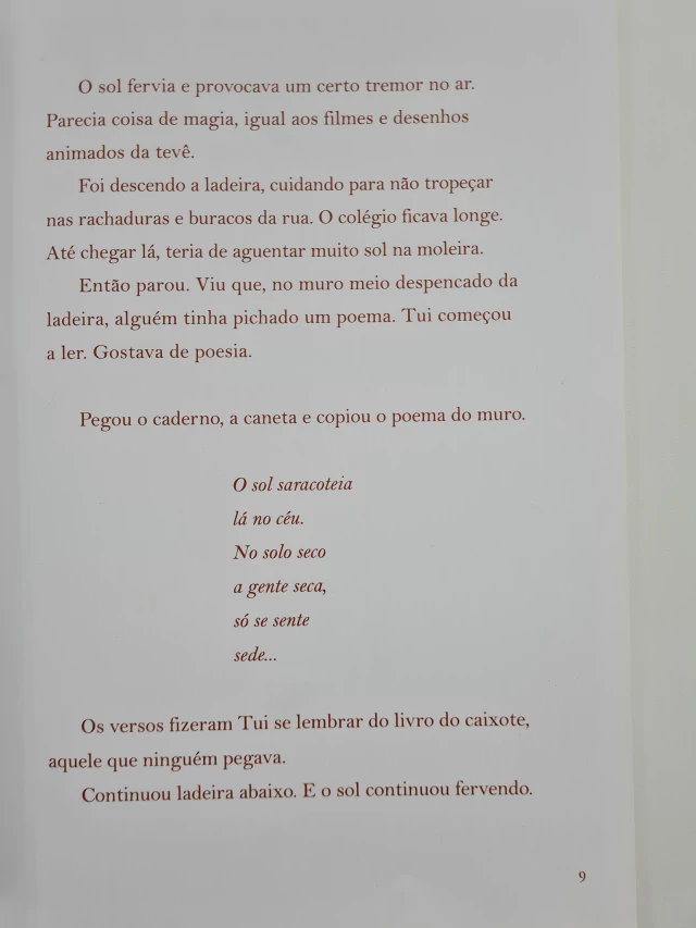 Tui caminha pelas ruas e encontra poesia nas paredes. Na escola, Tui se refugia nos versos do livro de poemas e fica encantado ao descobrir como as palavras podem falar das coisas simples e das inexplicáveis.