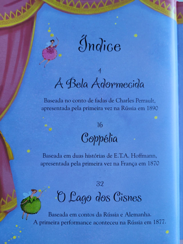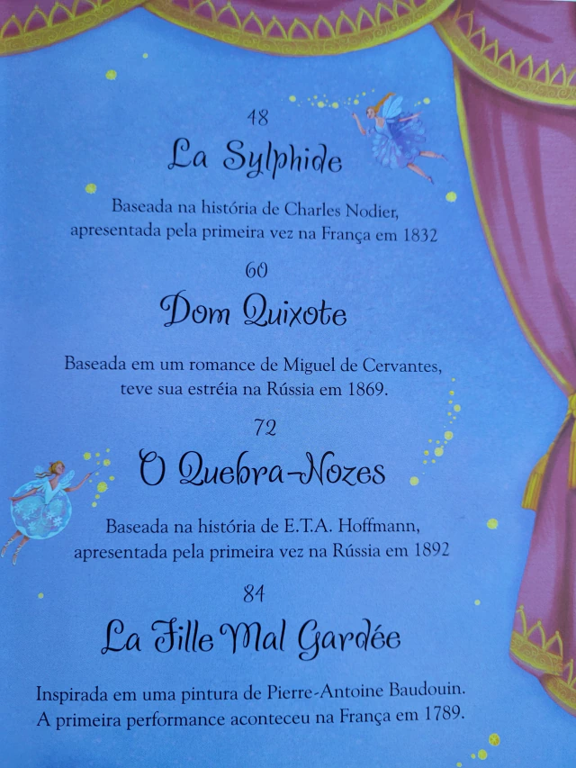 Descubra as lindas histórias de sete das mais famosas peças do balé mundial. Apaixone-se pelo Lago dos Cisnes, comova-se com La Sylphide, ria com Dom Quixote e deixe-se encantar pela magia de O Quebra-Nozes.