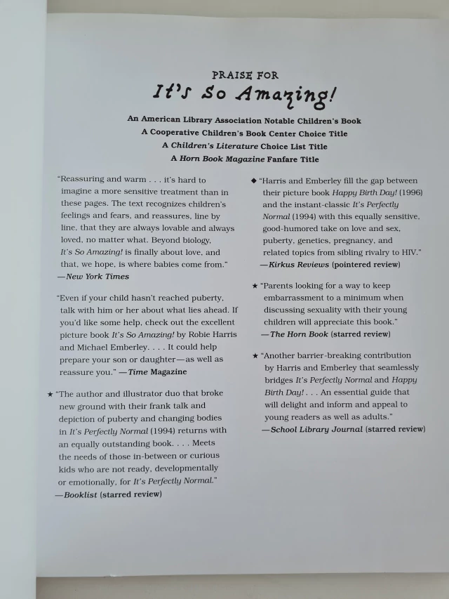 From the trusted team of Robie H. Harris and Michael Emberley, this classic resource for younger children receives its most ambitious update yet. How does a baby begin and how is it born? How did I begin? Why are some parts of kids' bodies different from some parts of other kids' bodies? Most younger kids have questions about reproduction, babies, love, sex, and gender too. Some also have concerns. For over twenty years, It's So Amazing! has provided children age seven and up with the honest answers they're looking for through age-appropriate, reassuring words and accurate, up-to-date, inclusive art. Throughout the book, two cartoon characters, Bird and Bee, are the voices of kids. They talk together to help children feel that they are not the only ones wondering how we all began. Rigorously vetted by experts and featuring updated and new facts on pregnancy, birth, adoption, bodies, sexuality, gender identity, OK touches, not-OK touches, straight and LGBTQ+ families and people, and many other topics, thiscomprehensive resource for kids, parents, librarians, teachers, booksellers, and healthcare providers is the book that can help younger kids and their families talk together and find answers to their many questions.