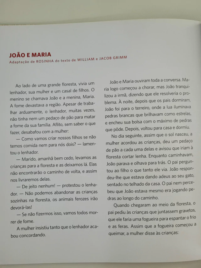João e Maria é uma história que é narrada há mais de um século e ainda fascina crianças e adultos ao redor do mundo. Neste novo livro, a autora e ilustradora Rosinha decide encarar o desafio de recontar a história desses dois irmãos usando apenas imagens. O resultado é um livro encantador e repleto de ilustrações belas e impactantes. O livro conta com uma adaptação do texto original, mas este aparece só no final. Trata-se de um convite para que pais e filhos contem essa aventura usando as suas próprias palavras, ajudando essa história a permanecer imortal.