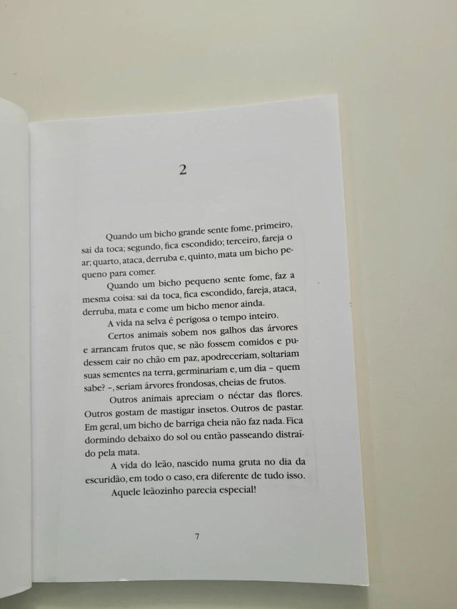 Aquele leãzinho parecia especial! Desde que nasceu, foi amado e respeitado por todos. (...) Quantas vezes o filhote de leão, perdido no mato, foi trazido de volta para casa durante a noite por um bando de vagalumes? Quantas e quantas vezes, feridoemalguma caçada ou numa queda do alto do penhasco, teve seus ferimentos lambidos por ferozes lobos do mato? Uma vez, durante as grandes secas, um raio caiu incendiando a floresta. Foi um espetáculo triste. As labaredas judiavam das árvores enquanto a fumaça rodopiava feito uma neblina venenosa. O leãozinho? Escapou fácil graças a um papagaio que, pousado em sua cabeça, foi indicando o melhor caminho para engabelar.
