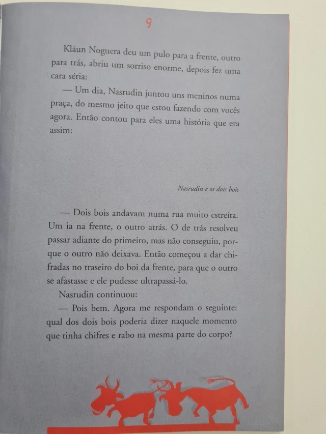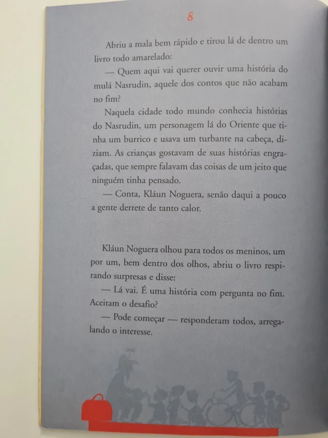 Como em Formiga Aurélia e outros jeitos de ver o mundo, neste livro Regina Machado demonstra uma fina compreensão da tradição oral, dos aspectos éticos e formais que dão vigor a essas narrativas sem dono. Originário do folclore da Turquia, o personagem Nasrudin é um mulá (que em árabe significa "mestre"). É um herói curioso: parece ingênuo de tudo, mas é mais esperto do que todos nós. Alguns de seus contos são dignos de um verdadeiro sábio oriental, com enigmas lógicos e soluções mirabolantes. Outros são casos de simpática malandragem, de confusões que só se resolvem com muita esperteza. Nasrudin às vezes lembra um personagem muito familiar aos leitores brasileiros: Pedro Malasartes, cujas travessuras e astúcias são narradas há séculos nos países de cultura ibérica.Regina Machado combinou os contos do mulá com a história de uma divertida turma de amigos reunidos em torno de Kláun Noguera, uma espécie de contador de histórias que os desafia a adivinhar como Nasrudin se livra de enrascadas e passa a perna nos amigos, no rei e até mesmo na própria mulher.Título Altamente Recomendável pela Fundação Nacional do Livro Infantil e Juvenil - FNLIJ 2001, categoria reconto