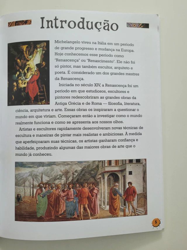 No século XIV, teve início na Europa um empolgante período de progresso e mudança. Conhecido hoje como Renascença ou Renascimento, esse foi um tempo em que pintores, escultores e estuiosos redescobriram as grandes obras da Antiguidade grega e romana. Michelangelo viveu na Itália nessa época, e é considerado um dos maiores mestres da Renascença. Arte ao Redor do Mundo apresenta ao jovem leitor os principais períodos da arte e os artistas que contribuíram para seu desenvolvimento. Nesses períodos, diferentes estilos artísticos foram criados em outras partes do mundo, e muitos deles estão neste livro.