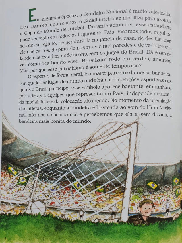 Em um texto literário e informativo, o autor relata a história da Bandeira do Brasil, desde o Período Colonial até os dias de hoje. Também explica quais os significados dos antigos brasões e das cores, os locais onde deve estar hasteada, cuidada e amada por todos os brasileiros e como utilizá-la corretamente em comemorações, solenidades, desfiles e no cotidiano.