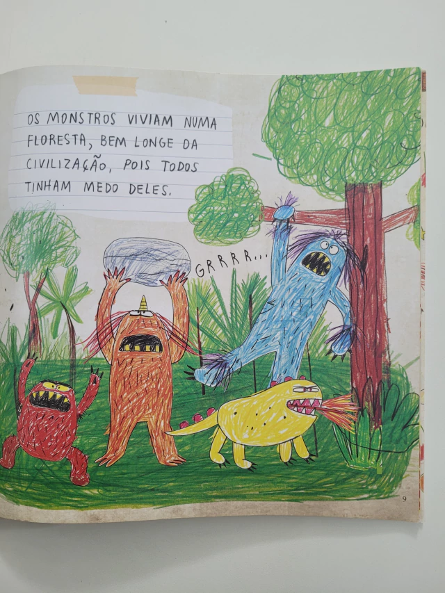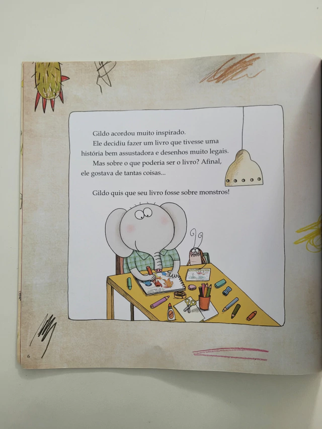 Em um dia de inspiração, Gildo, com o apoio da irmã Laurinha, do pai, da mãe e dos amigos, começa a escrever um livro uma incrível narrativa assustadora sobre monstros! Nesse processo de escrita, como não quer desapontar ninguém, o elefante busca ouvir e atender à opinião de todos, porém isso não é tão simples quanto parece. Os monstros ferozes, agora, são bons monstros bailarinos que recebem a visita de extraterrestres e são atacados por um robô malvado... ou por piratas? Ou por uma rainha má? Mas e a opinião de Gildo? Como ele gostaria de terminar essa história? Ainda bem que a Socorro tem um conselho especial para dar ao amigo elefante. Nessa obra, o leitor irá encontrar uma narrativa dentro de outra uma, terna e delicada; a outra, mirabolante, assustadora e divertida!