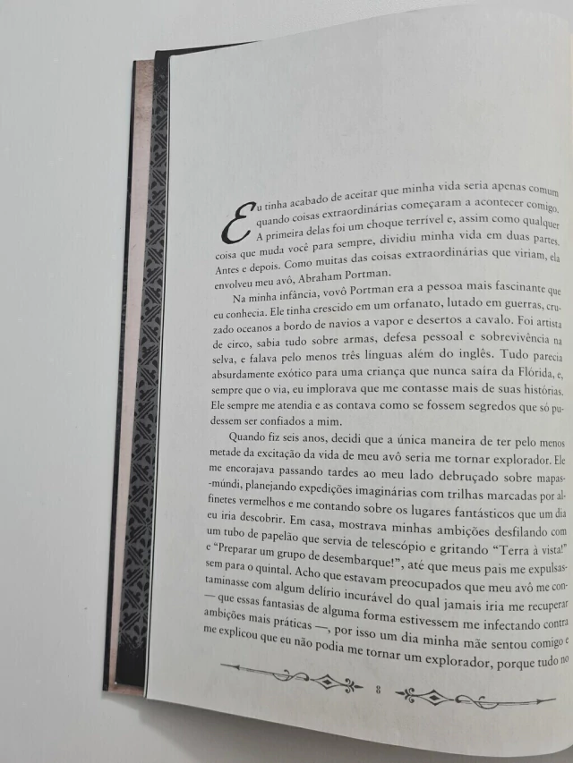 O orfanato da Srta. Peregrine para Crianças Peculiares é um romance que mistura ficção e fotografia. A história começa com uma tragédia familiar que lança Jacob, um rapaz de 16 anos, em uma jornada até uma ilha remota na costa do País de Gales, onde descobre as ruínas do Orfanato da Srta. Peregrine para Crianças Peculiares. Enquanto Jacob explora os quartos e corredores abandonados, fica claro que as crianças do orfanato são muito mais do que simplesmente peculiares. Elas podem ter sido perigosas e confinadas na ilha deserta por um bom motivo. E, de algum modo - por mais impossível que possa parecer - ainda podem estar vivas.