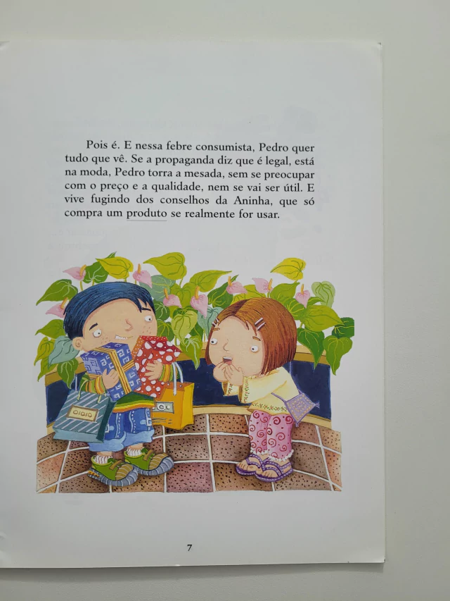 Esta é uma história divertida. Aninha é a legítima consumidora consciente. Escolhe com cuidado os produtos, pesquisa preços e pensa bem antes de comprar. Já Pedro, compra tudo por impulso. Não se preocupa com os preços, vai atrás de tudo o que é anunciado na televisão e nem sequer lembra de pedir nota fiscal.