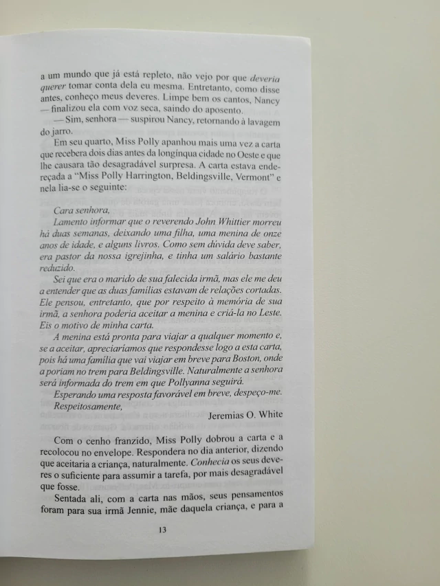Pollyanna é uma história sobre amor, amizade e, sobretudo, do surpreendente poder de transformação que crianças e adolescentes detêm sem que percebam. Pollyanna é otimista, positiva, alegre, feliz. Não aceita justificativas para a tristeza; dedica-se com afinco a ensinar a todos o caminho para superar as adversidades. A obra é um clássico da literatura infantojuvenil. Escrita em 1912, foi inicialmente publicada em capítulos no jornal Christian Herald de Boston. Ganhou forma de livro, sendo publicado em 1913 e de imediato tornou-se um best-seller. Teve a primeira adaptação ao cinema em 1920, e viria a ser refilmada muitas vezes, inclusive pelos estúdios Disney. Pollyanna é jovem, mas apresenta muita maturidade e serenidade perante os problemas. Este clássico da literatura mundial nos ensina a viver de forma mais leve e otimista.