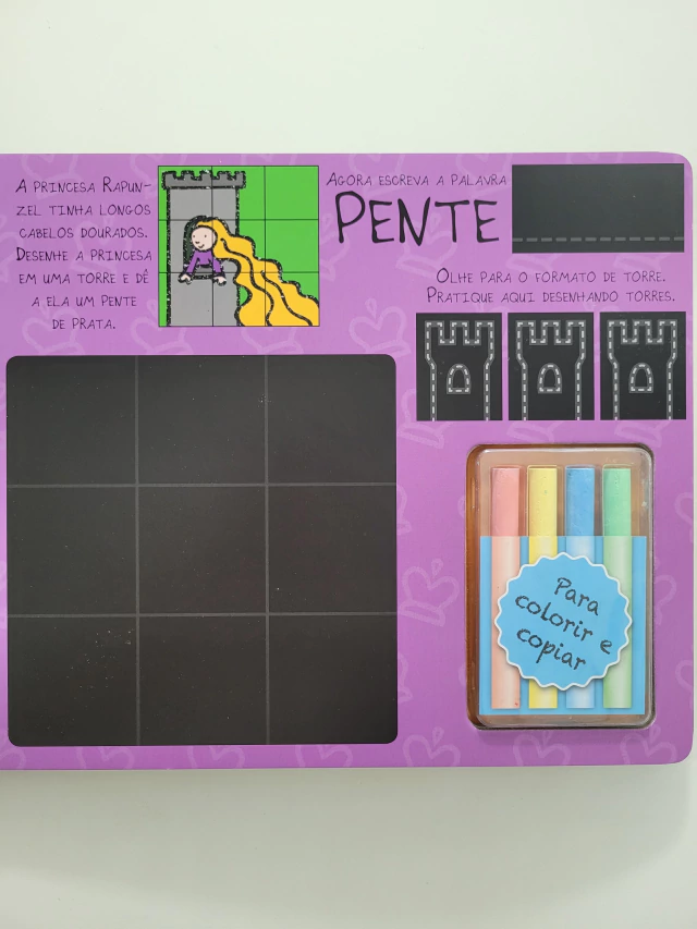 A prática leva á perfeição! Quatro gizes coloridos e páginas tipo lousa reúnem horas de diversão de atividades para escrever e apagar. As crianças vão adorar copiar e desenhar uma série inteira de princesas, com alguns treinos de aprendizagem inicial de letras e números.