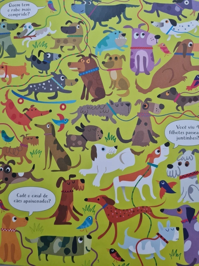 Preparar, apontar... ACHAR! Este livro tem 25 páginas de desenhos divertidos de cães, gatos e outros animais para encontrar e contar, além de muitas perguntinhas para desafiar seus olhos e seu poder de concentração