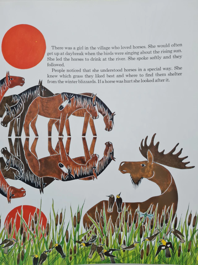 "There was a girl in the village who loved horses... She led the horses to drink at the river. She spoke softly and they followed. People noticed that she understood horses in a special way".