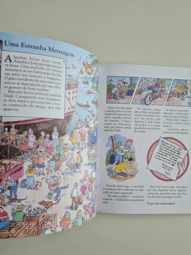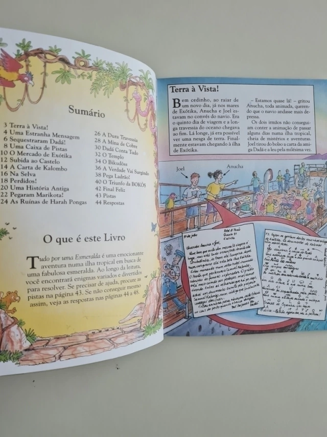 Cada livro desta série conta uma emocionante história de aventuras cheia de incríveis quebra-cabeças para você resolver. Ecistem pistas para dar uma ajudinha e todas as respostas aparecem novfinal do livro. Quando Anucha e Joel chegaram à ilha tropical de Exótika estavam se envolvendo numa sinistra conspiração sem saber. Dadá a amiga que os convidada para visitar a ilha sumira misteriosamente deixando apenas uma mensagem que os levaria a uma aventura de tirar o fôlego. Logo eles se embrenharam na selva na selva tropical em busca dos segredos de uma antiga civilização de uma fabulosa esmeralda com estranhos e místicos poderes.