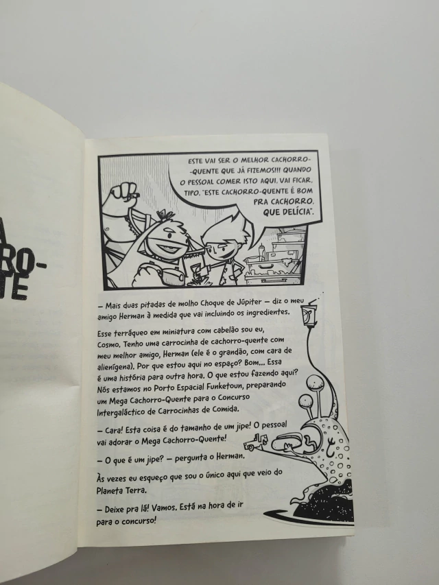 Eu sou Cosmo, o Garoto Terraqueo. Sou o capitao da nave Salsicha Neon. Vivo me metendo em confusao, mas minha maior paixao e a culinaria quando nao estou ocupado em salvar o mundo, e claro. Junto com Herman, meu melhor amigo, vendo o melhor cachorro-quente da galaxia.