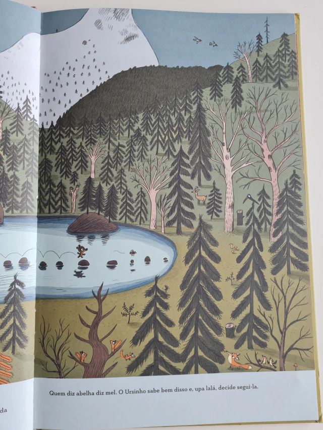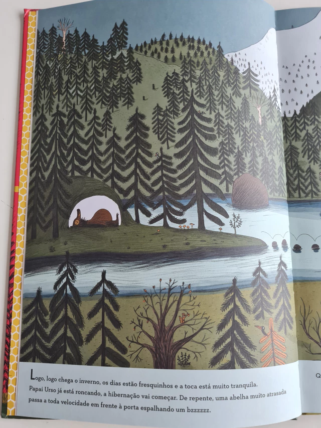 Papai Urso já está roncando, a hibernação vai começar. De repente, uma abelha muito atrasada passa a toda velocidade em frente à porta espalhando um bzzzzzz. Quem diz abelha diz mel. O Ursinho sabe bem disso e, upa lalá, decide segui-la. Papai Urso sente uma corrente de ar bem onde deveria sentir o quentinho da barriga do Ursinho. Mas onde ele se meteu, pergunta-se então Papai Urso...