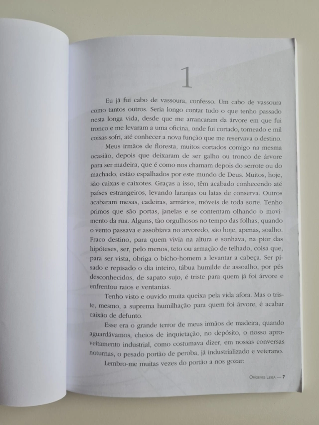 Mais uma vez Orígenes Lessa surpreende o leitor por sua originalidade em criar histórias bem-humoradas e profundamente reflexivas e críticas. Nesta, o narrador-personagem, um cabo de vassoura lúcido e sábio, conta sua trajetória desde que o arrancaram de uma árvore até sua trágica incursão ao mundo dos homens. A narrativa, irônica, dinâmica e engraçada, prende a atenção do leitor que, pela voz do protagonista, não tem como não reavaliar questões essenciais da natureza humana e rever a construção de uma sociedade mais justa e mais solidária. Eu já fui cabo de vassoura, confesso. Um cabo de vassoura como tantos outros. Seria longo contar tudo o que tenho passado nesta longa vida, desde que me arrancaram da árvore em que fui tronco e me levaram a uma oficina, onde fui cortado, torneado e mil coisas sofri, até conhecer a nova função que me reservava o destino.