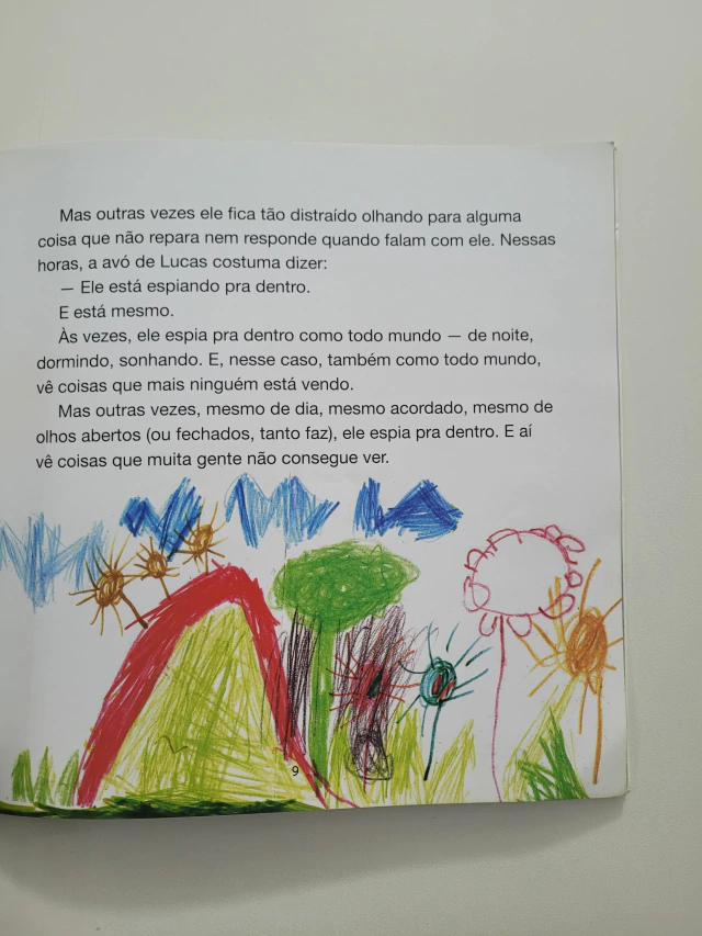Em O menino que espiava para dentro, Ana Maria Machado, sempre com as palavras tão bem articuladas, conta a história de Lucas, um menino com a maior facilidade de sonhar, de imaginar. Mesmo prestando muita atenção em tudo, tudo também é motivo para ele se distrair e entrar em um outro universo mágico, longínquo, distante. Inventa um amigo, Talento ou Tamanco ou Tatá, anda sobre ondas, come a maçã do sono profundo, mora em conchas, voa pelos ares, vê automóveis-leões, bosques de caramelos Não dava para espiar mais nada, para ver nada, nem na frente nem atrás. Só aquele breu profundo. Ele, de um lado. Do outro, o mundo. De repente um beijo, um abraço, os olhos se abrindo, a luz brilhando no espaço. Você é uma princesa? A mãe riu Uma narrativa que resgata na criança a fantasia, a liberdade, o encantamento, a possibilidade de brincar em outros reinos, em outras épocas, de serem outros seres.