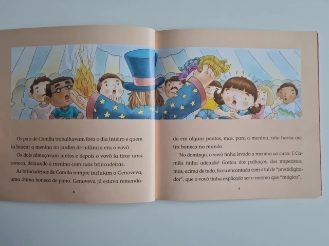 Camila assistiu a um espetáculo de mágicas pela primeira vez na vida e ficou maravilhada! Tão maravilhada que decidiu aprender a tirar moedas do nariz das pessoas, pombas brancas de dentro de lenços e coelhos de cartolas. Coelho ela não tinha nenhum, por isso resolveu usar sua querida boneca Genoveva no lugar do coelho. Mas, e a cartola? E não é que foi encontrar uma justamente no velho baú do Vovô? Mas... ah! Foi só enfiar sua boneca dentro da cartola do Vovô, dizer a palavra mais mágica de que era capaz que... Horror! Que a Genoveva desapareceu de verdade! E agora? O que Camila pode fazer para salvar sua boneca perdida no terrível País das Mágicas Malfeitas?
