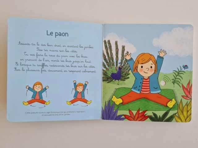 Le yoga pour les tout-petits! C'est une première approche du yoga pour les tout-petits que nous propose Stéphanie Couturier qui le pratique au quotidien avec ses petits élèves à travers des postures adaptées: le paon, le papillon, le cobra, l'enfant ou encore le papillon, la sauterelle ou le chat. Sur la page de gauche, un texte destiné aux parents pour un moment de découverte corporelle, de calme et de concentration avec leur enfant. En face, l'illustration avec un enfant dans la posture ainsi que le symbole associé et la puce sonore pour que le petit soit autonome avec son livre. Les premières postures de yoga des tout-petits!