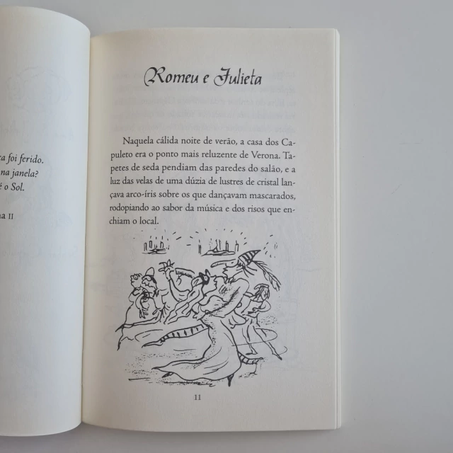 Já disse Romeu que zomba da dor quem nunca foi ferido. E existe no mundo uma só alma que não tenha sofrido de amor? Se existe, é a mesma que nunca ouviu falar de Romeu e Julieta, talvez a história de amor mais conhecida de todos os tempos. Nesta adaptação dirigida ao público infantojuvenil, a peça de William Shakespeare foi transformada em prosa e ganhou ilustrações em preto e branco do premiado artista inglês Tony Ross. O livro inclui ainda um prefácio de Heloisa Prieto e dois posfácios: um discute a questão do amor e do ódio na trama e o outro trata do Globe Theatre, onde muitas das peças de Shakespeare foram encenadas pela primeira vez. Este é o volume inicial de uma série de adaptações, destinadas ao público juvenil, das histórias mais conhecidas desse autor excepcional.