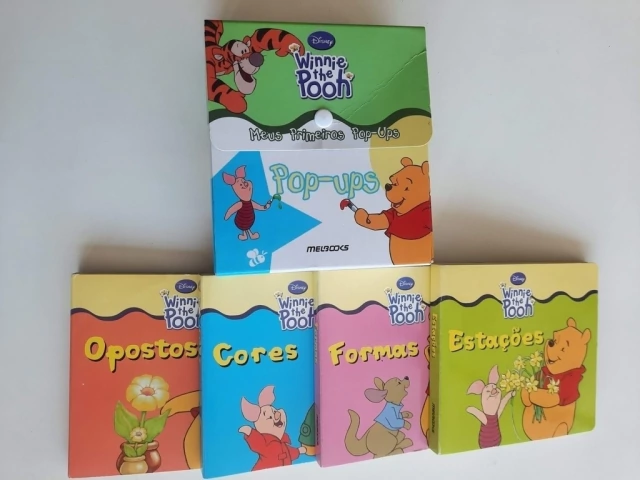 Baseado nas obras de "O Ursinho Pooh", este kit contém quatro livrinhos: estações, formas, opostos e cores.